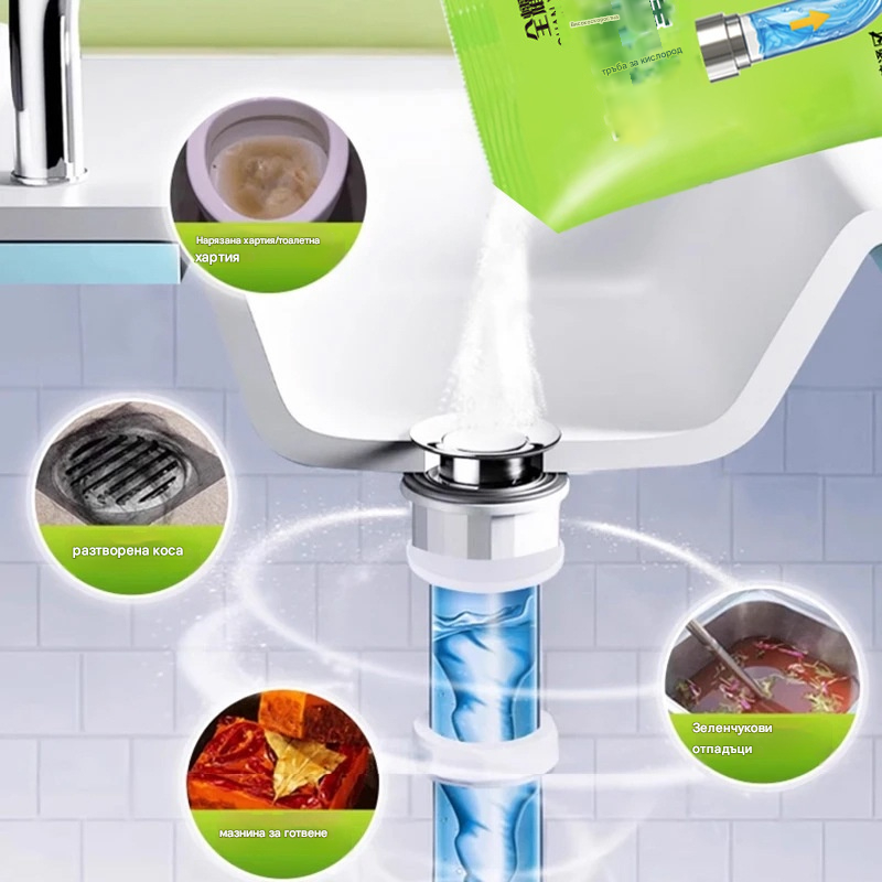 Ефервесцентен прах за почистване на канали - Мигновено разтваря мазнини и запушвания, премахва миризми и котлен камък, не уврежда тръбите, гаранция за връщане на парите